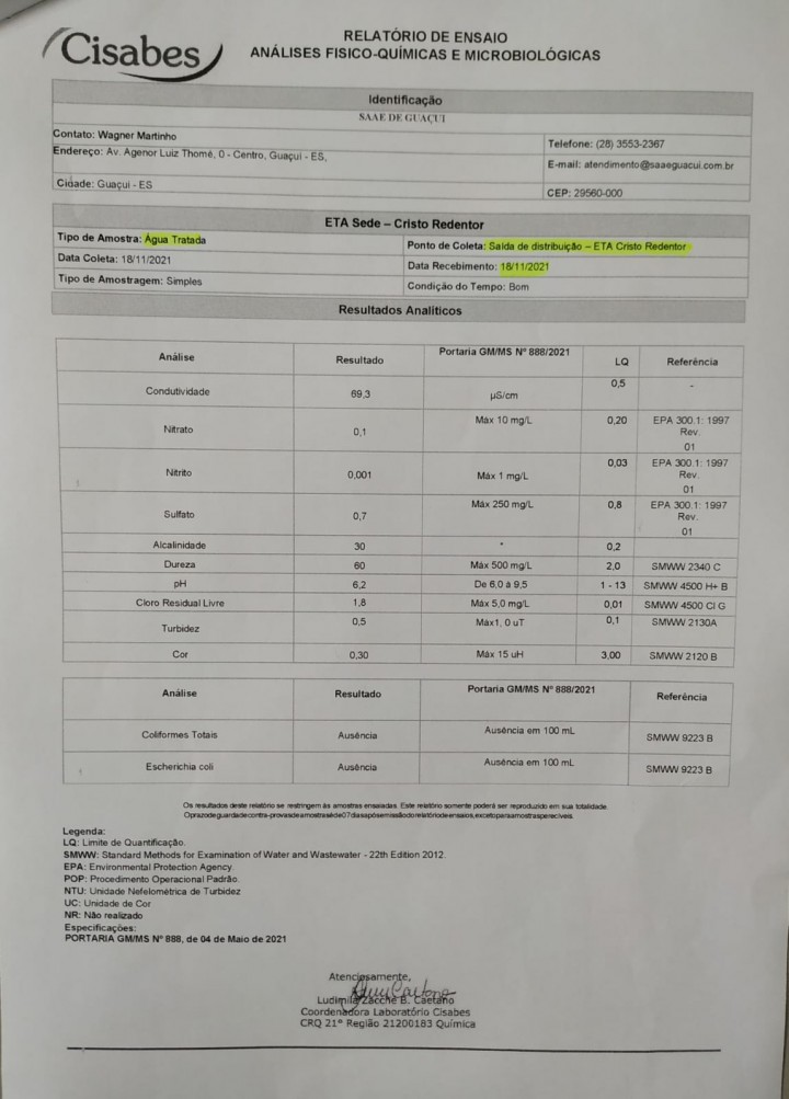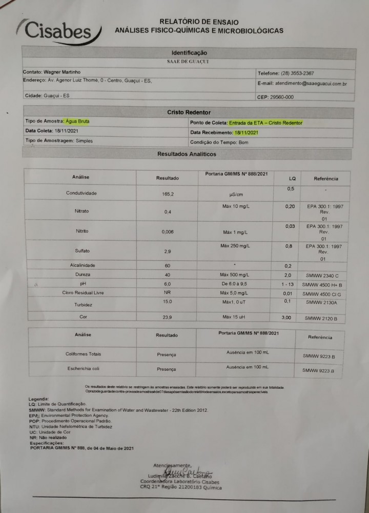 O Consórcio Intermunicipal de Saneamento Básico (CISABES) - ES, em prestação de serviços de cooperação técnica junto ao Serviço Autônomo de Água e Esgoto de Guaçuí (SAAE), com a realização de análises das águas: Bruta (água antes do tratamento que é considerada imprópria para o consumo Humano) e água tratada (água após o tratamento que atendendo a portaria do Ministério da Saúde é considerada própria para o consumo humano). Com a realização das análises das águas no dia 18 de novembro de 2021, seguindo as conformidades do padrão microbiológicos de potabilidade e atendimento aos parâmetros da Portaria MS N°2914/2011 e Especificação: Portaria GM/MS Nº888, de 04 de maio de 2021.