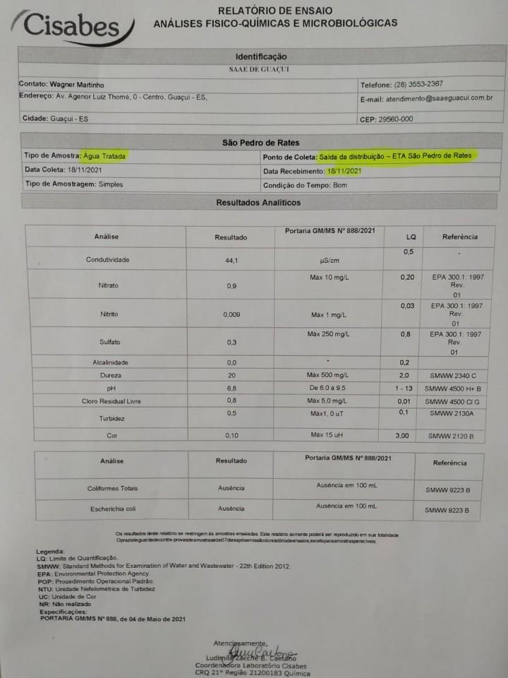 O Consórcio Intermunicipal de Saneamento Básico (CISABES) - ES, em prestação de serviços de cooperação técnica junto ao Serviço Autônomo de Água e Esgoto de Guaçuí (SAAE), com a realização de análises das águas: Bruta (água antes do tratamento que é considerada imprópria para o consumo Humano) e água tratada (água após o tratamento que atendendo a portaria do Ministério da Saúde é considerada própria para o consumo humano). Com a realização das análises das águas no dia 18 de novembro de 2021, seguindo as conformidades do padrão microbiológicos de potabilidade e atendimento aos parâmetros da Portaria MS N°2914/2011 e Especificação: Portaria GM/MS Nº888, de 04 de maio de 2021.