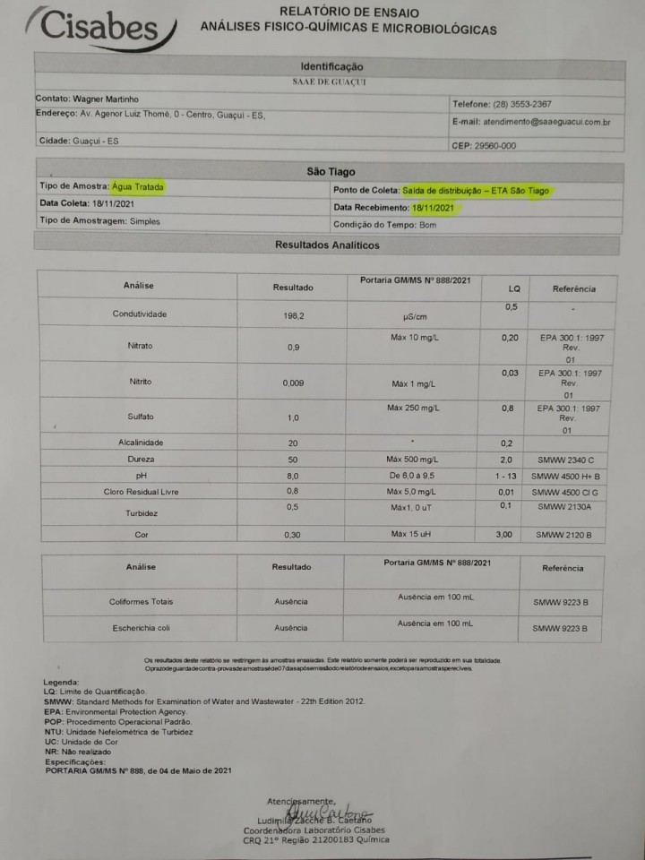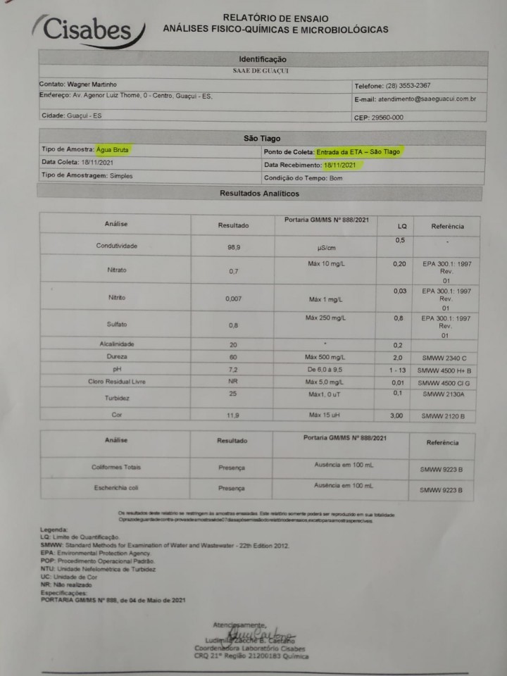 O Consórcio Intermunicipal de Saneamento Básico (CISABES) - ES, em prestação de serviços de cooperação técnica junto ao Serviço Autônomo de Água e Esgoto de Guaçuí (SAAE), com a realização de análises das águas: Bruta (água antes do tratamento que é considerada imprópria para o consumo Humano) e água tratada (água após o tratamento que atendendo a portaria do Ministério da Saúde é considerada própria para o consumo humano). Com a realização das análises das águas no dia 18 de novembro de 2021, seguindo as conformidades do padrão microbiológicos de potabilidade e atendimento aos parâmetros da Portaria MS N°2914/2011 e Especificação: Portaria GM/MS Nº888, de 04 de maio de 2021.