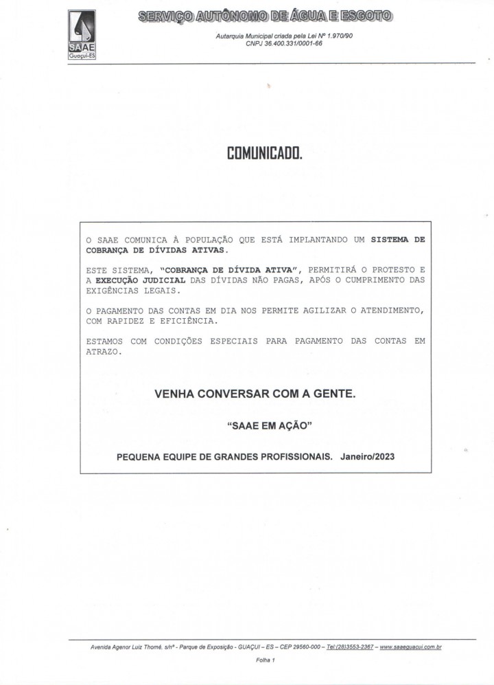 O SAAE comunica à população que está implantando um "SISTEMA DE COBRANÇA DE DÍVIDAS ATIVAS".