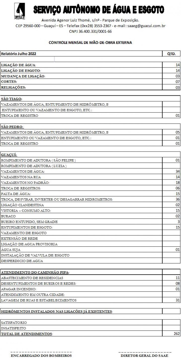 Noticia Relatório Julho 2022 - Controle mensal de mão-de-obra externa Quantitativo de serviços externos (realizados na rua) pelos bombeiros e caminhão pipa há 3 meses • Atendimento